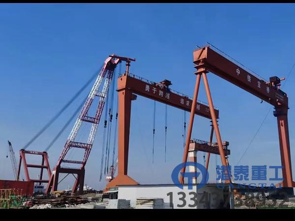 江蘇淮安造船門式起重機是為造船廠專門設計的起重機,主要用于吊運船舶的分段及零部件的裝配,其主要特點:起重噸位大,跨度大,起升高度大及多機構協同作業等因素,起重機由橋主梁、柔/剛性支腿、大車運行機構、小車、電氣設備組成。